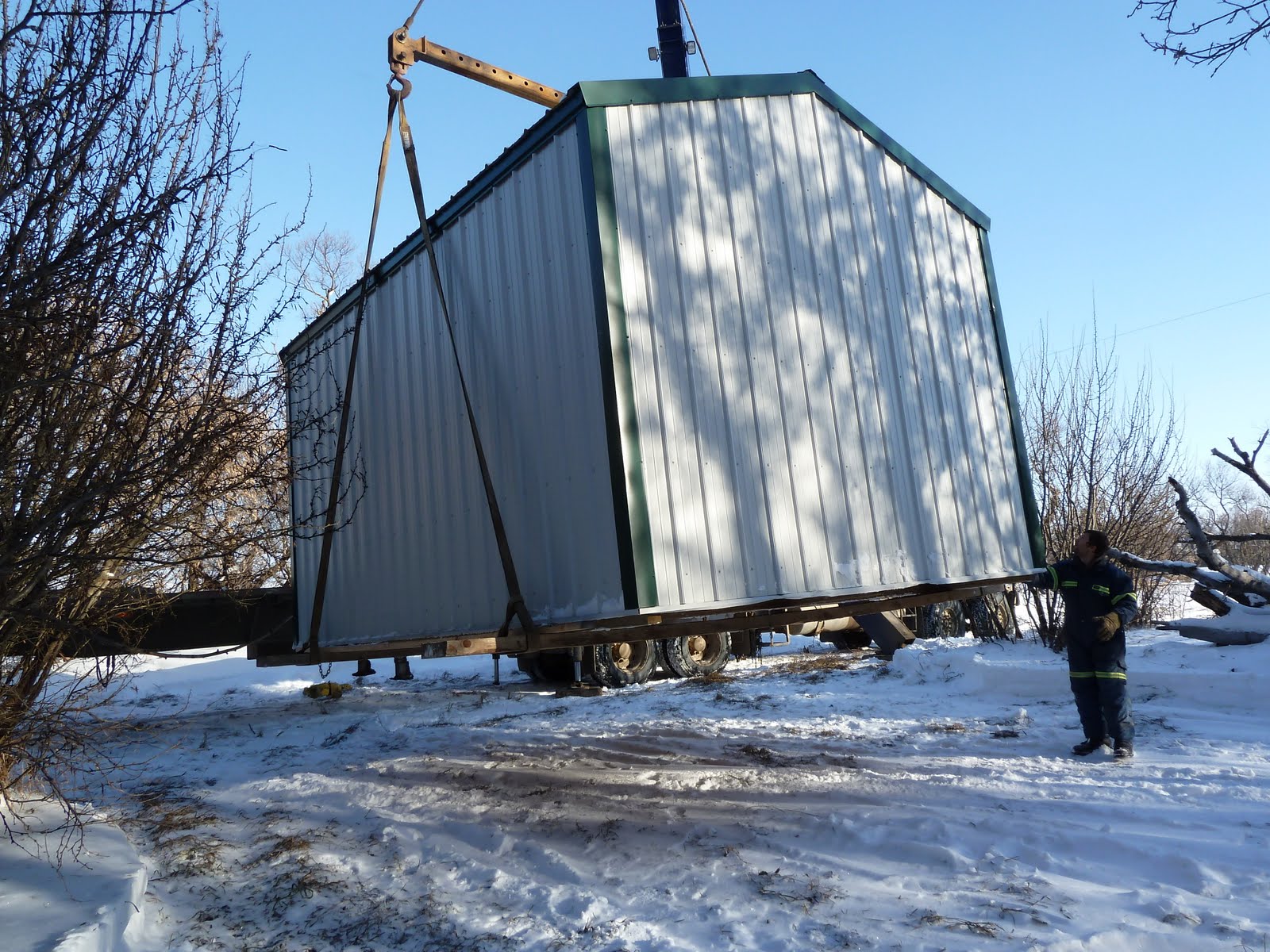 The club put out two new shelters for the 2010-11 season. Corning has a brand new shelter and it is now called "Norm's Palace". It has a new wood shed and a new cast iron stove, and its located at the same spot as the old one along trail 311D. The other new shelter is located about 13km west of Carlyle along 311A. Right now we have it stocked with wood, an axe and a cast iron wood stove. This new shelter is called "Beaver Lodge". We hope to have the solar panel and lights up by next Monday or sooner if someone volunteers to help out, call or text Troy Foster at 577-7771 if you would like to help out. We would like to thank Savanna Well Servicing for paying to have a picker load the Shelter and wood shed and move them to the new location. Also thank you to Harry Laurent and Arcola building supplies for giving us a great deal on the shelter and wood shed.